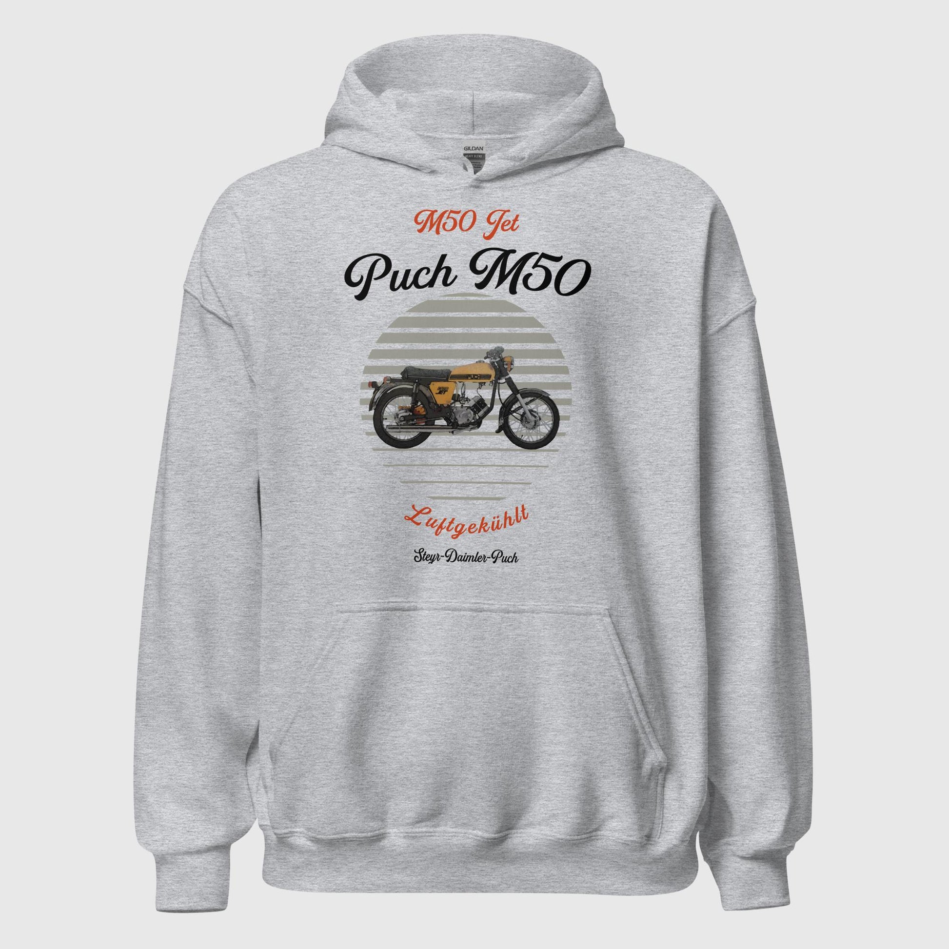Das Design des M50-Jet Retro-Moped-Hoodies ist geprägt von auffälligen Vintage-Grafiken, die das nostalgische Flair des M50-Jet-Mopeds einfangen. Mit seinem Retro-Aufdruck des Mopeds wird der Hoodie zum Blickfang und verleiht jedem Outfit einen individuellen Touch.