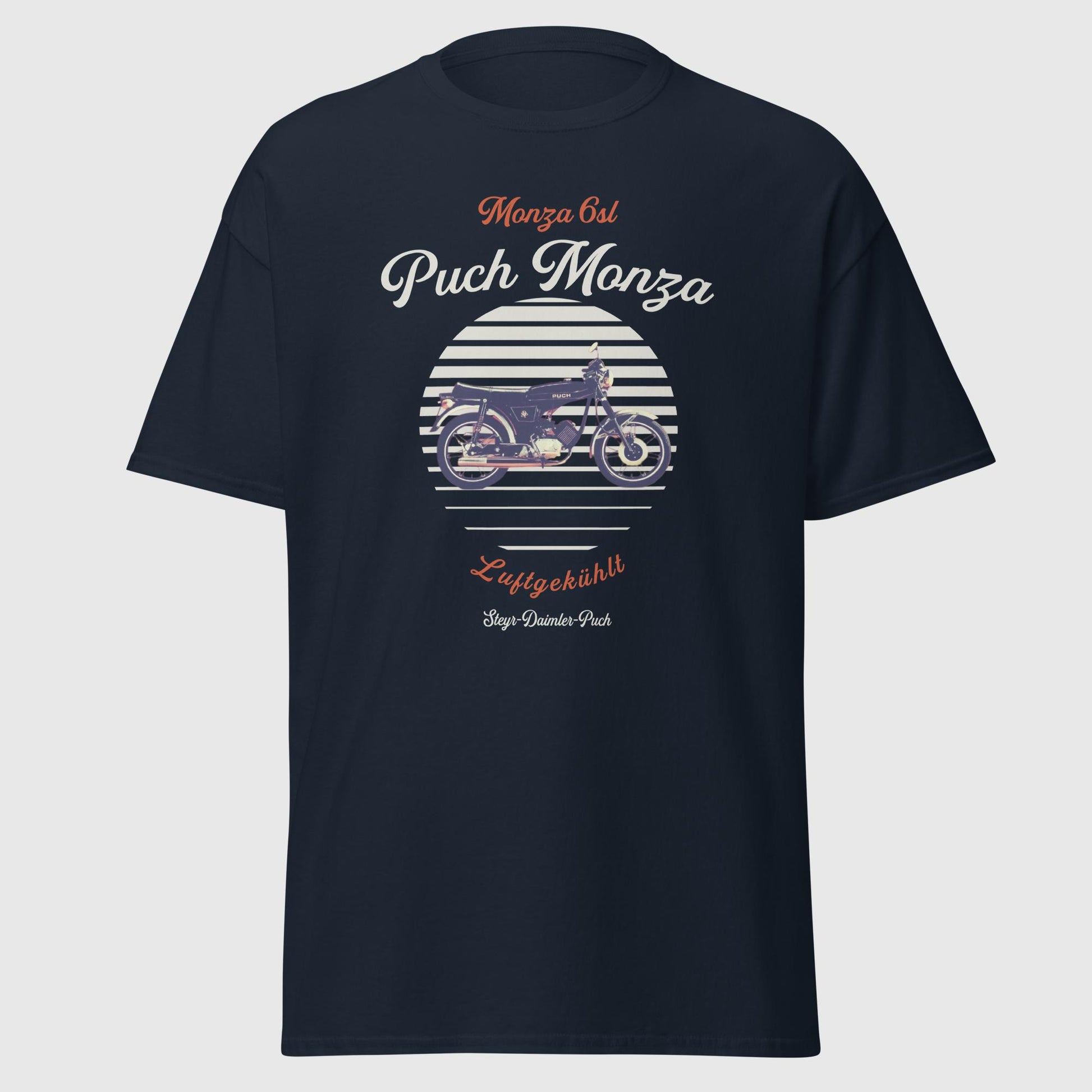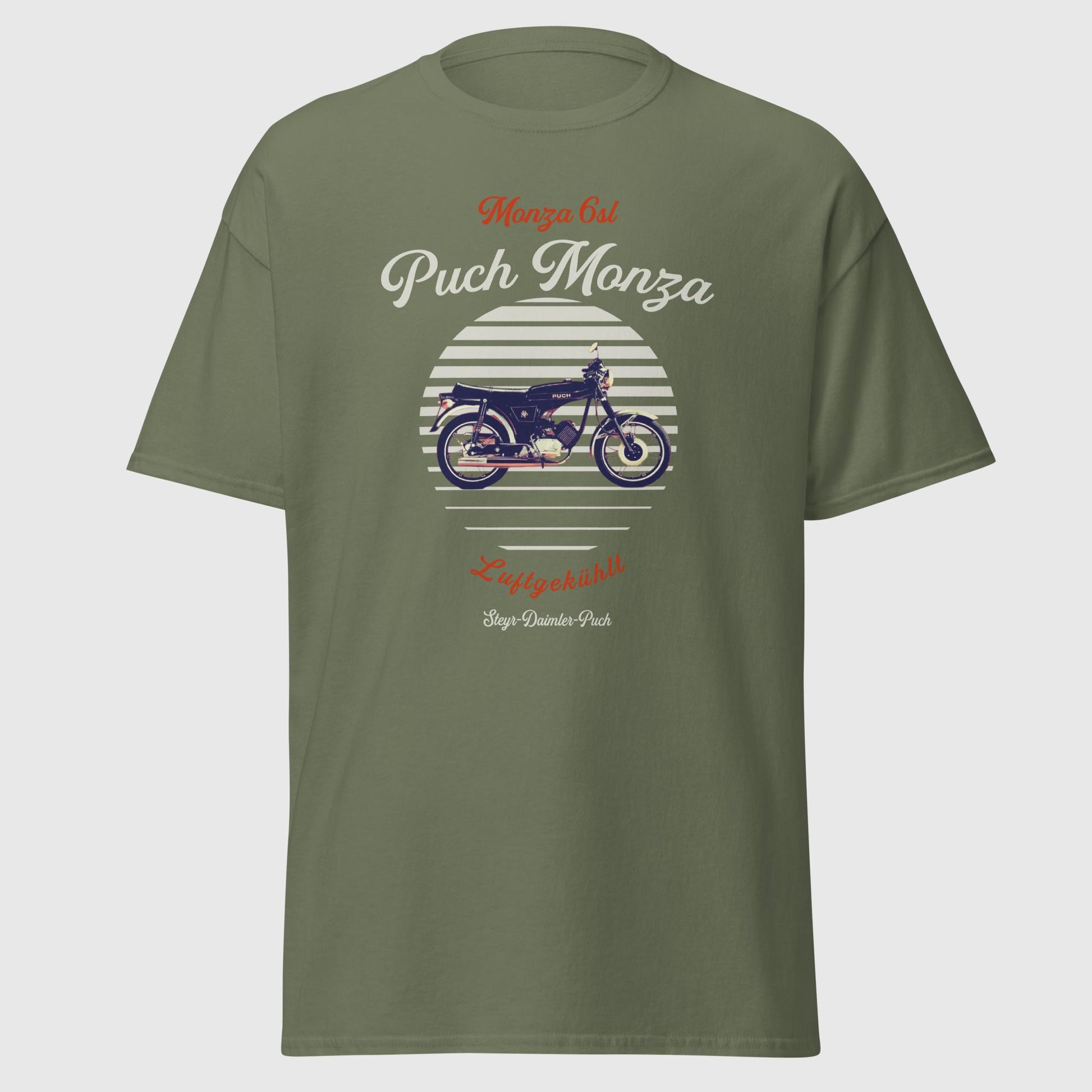 Tauche ein in die Welt der Dynamik und Eleganz mit dem Puch Monza 6SL T-Shirt. Dieses einzigartige T-Shirt präsentiert eine fesselnde Abbildung des Puch Monza 6SL Mopeds auf der gesamten Vorderseite, und bringt damit die unvergleichliche Schönheit und den Geist dieses Klassikers voll zur Geltung.